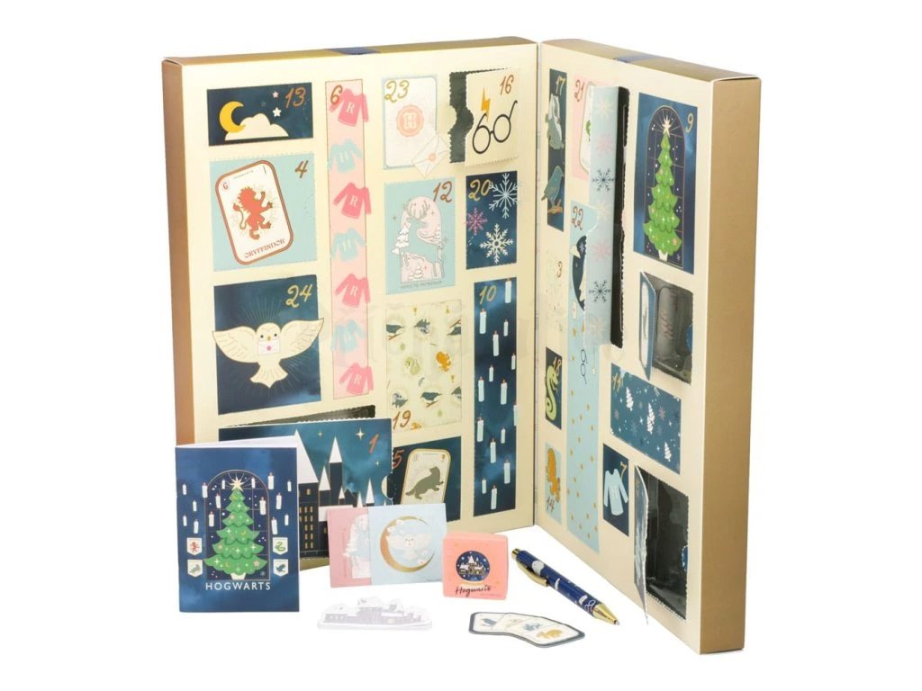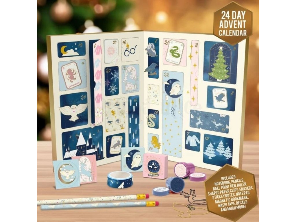 Odhalujte každý den nové okénko plné kouzelnických doplňků – tužky, magnety, poznámkové bloky, samolepky a další školní potřeby i tematické drobnosti. Kalendář je oficiálně licencovaný a dodáván v elegantním béžovém provedení s motivy Bradavic.