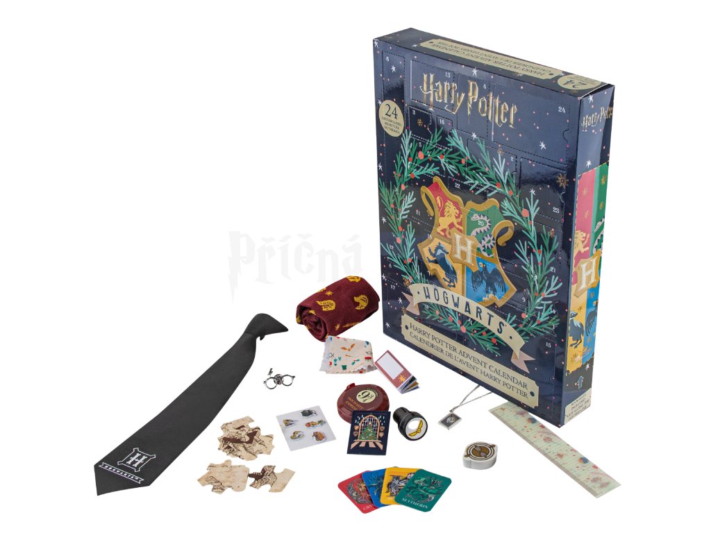 Za každým okénkem se skrývá malé překvapení. Kalendář obsahuje produkty v designu Harry Potter - magnetek, kravatu, záložku, pero, náhrdelník, klíčenku, washi páska, razítko, malý ručník, gumu apod.