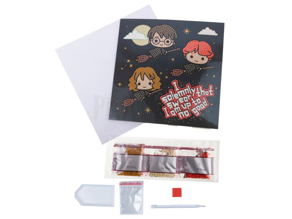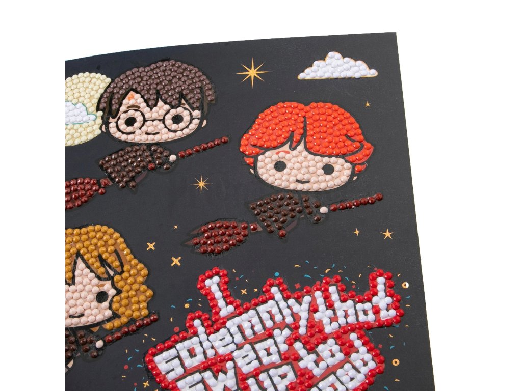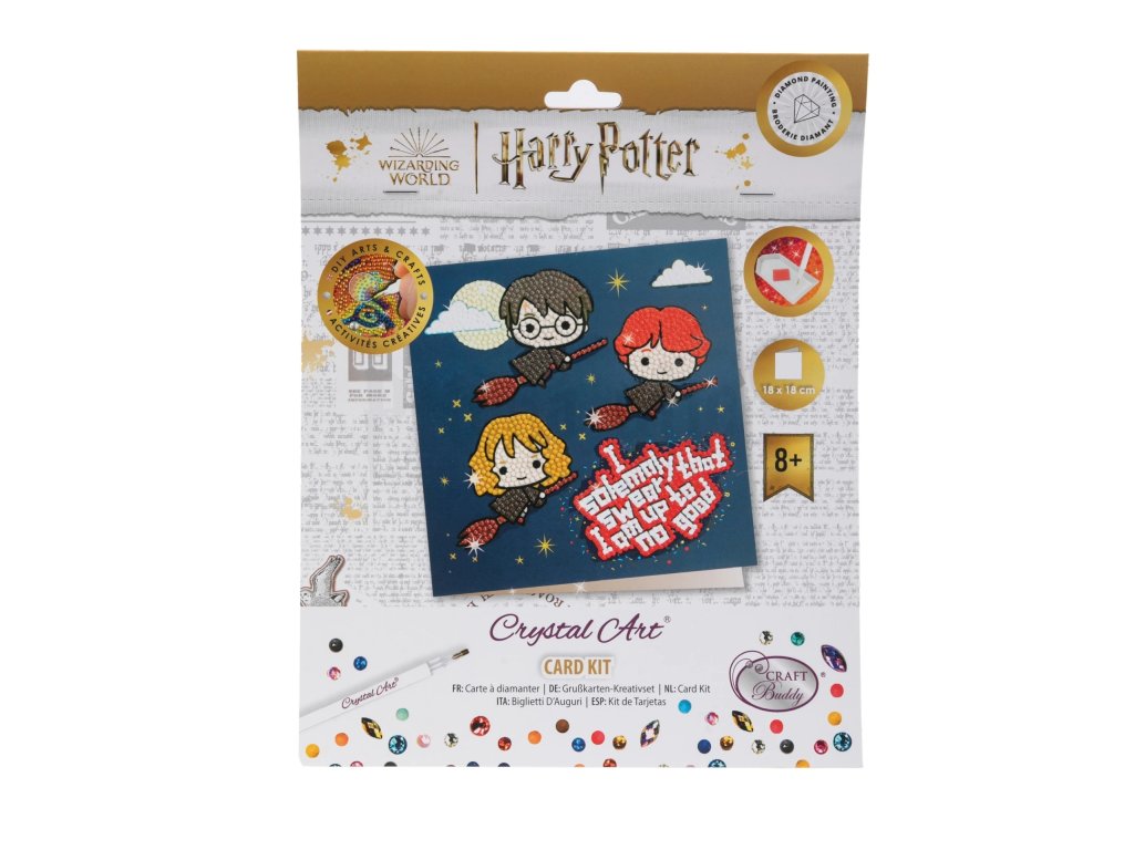 Produkty značky Crystal Art jsou ideálním dárkem pro každou kreativní duši. Tvoření pomocí nalepování krystalů je dobrým relaxem a odpočinkem pro dospělé a skvělou zábavou pro děti, které se mohou zdokonalovat ve zručnosti. Výslednou odměnou je pak jedinečný výtvarný výrobek - v tomto případě pak 18 x 18 cm pohlednice, na které je znázorněn Harry Potter, Hermiona Grangerová a Ron Weasley, jak letí na košťatech.