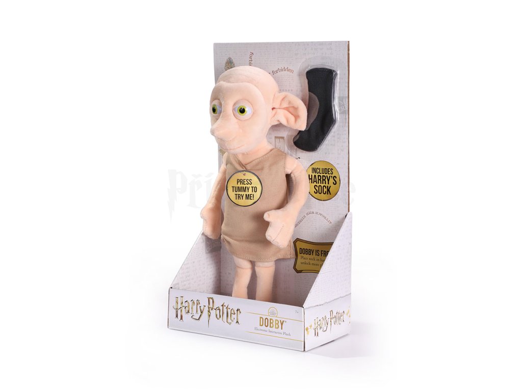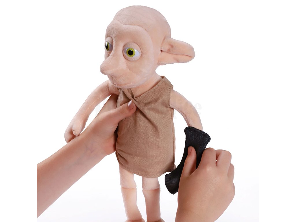 Dejte Dobbymu jeho ponožku! Tato interaktivní plyšová hračka Dobby mluví 16 frázemi – 10 zazní po stisknutí bříška a dalších 6, když mu do ruky vložíte ponožku.