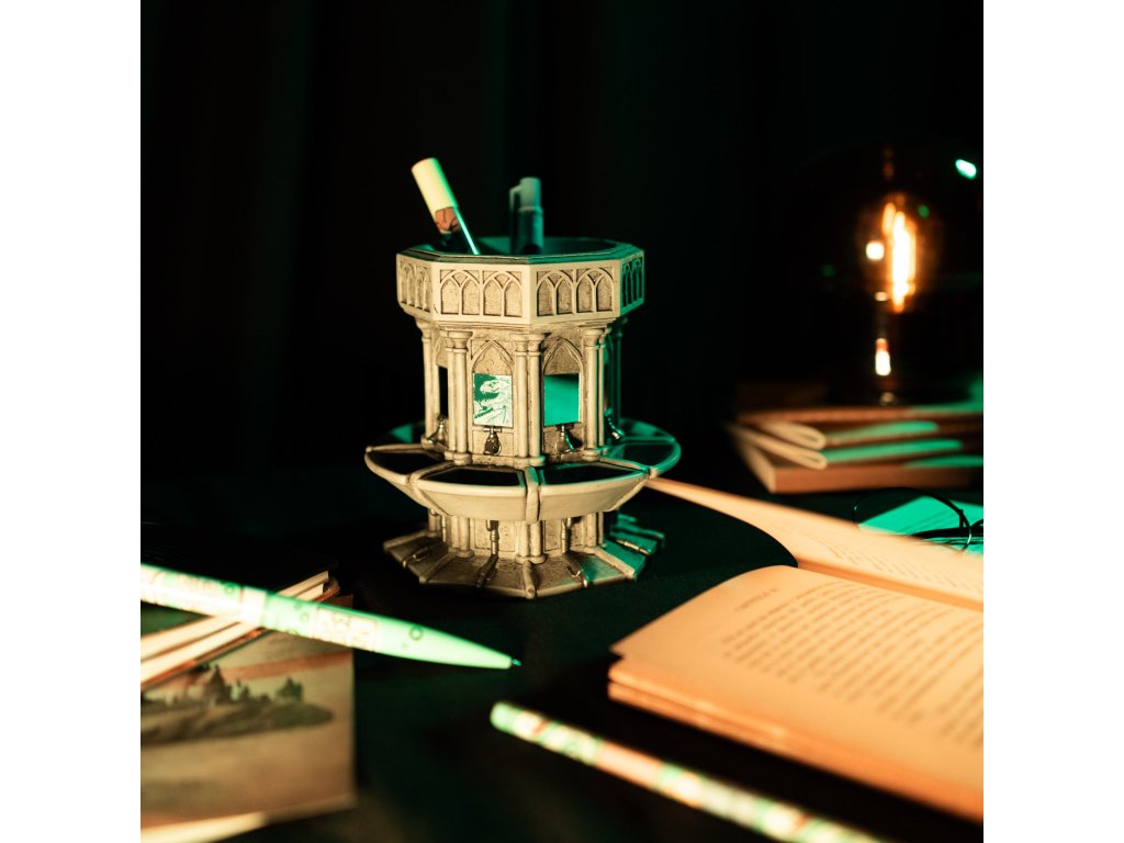 Sada sestávající z 3D držáku na pera a odpovídající sady papírenských potřeb. Držák na pera je vyroben z pryskyřice, ručně malovaný a měří 12,8 x 12,6 x 12,8 cm. Sada papírenských potřeb obsahuje 2 kuličková pera (jedno s černým inkoustem a jedno s modrým inkoustem), 1 tužku, 1 držák na gumu a 1 ořezávátko – vše je zdobeno tak, aby ladilo s designem a tématem držáku na pera a licencované postavičky.