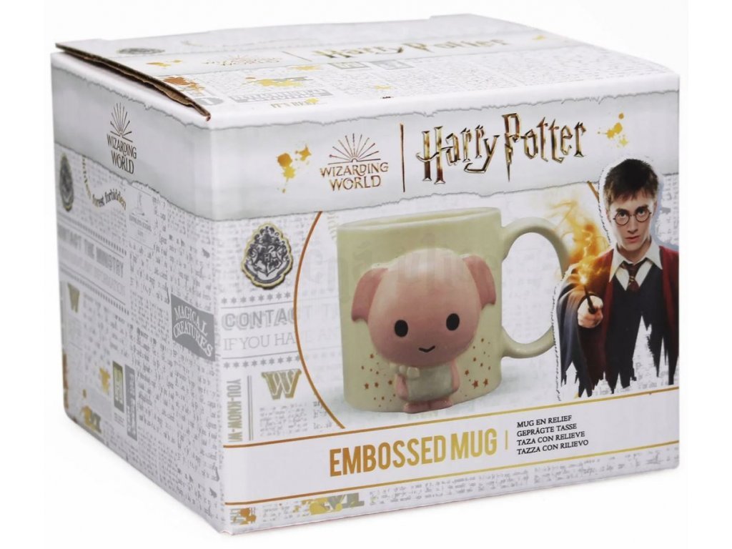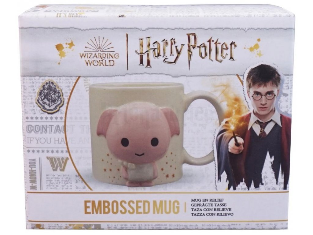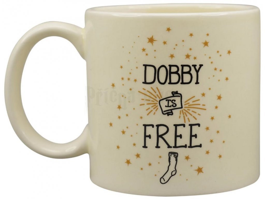 Hrnek s 3D motivem domácího skřítka Dobbyho ve stylu kawaii. Ze zadní strany hrnku je nápis "Dobby is free".