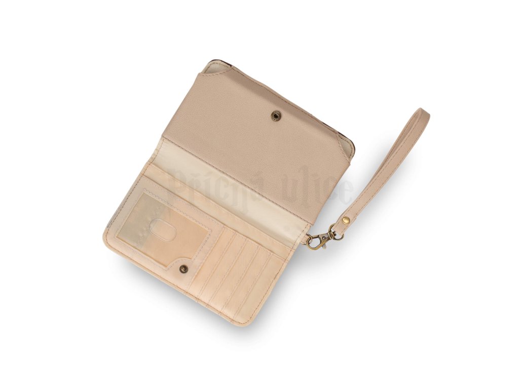 Tato peněženka je jako mini kufřík pro všechny nezbytnosti – vejde se do ní hotovost, platební karty i mobilní telefon. Odnímatelné poutko na zápěstí, kapsa na mince na zip, přihrádka na telefon.