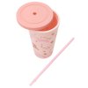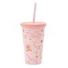 Růžový plastový kelímek s uzavíratelným víčkem a s brčkem, v designu hvězd, souhvězdí a sovy Hedviky.