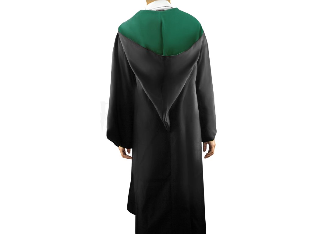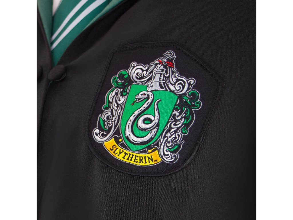 Na levé straně hrudi je vyšité detailní logo Zmijozelu s vyšitým stříbrným hadem, symbolem mazanosti, ambicí a síly, které jsou klíčovými hodnotami této koleje. Je vybaven velkou kapucí, která dodává tajemný a autentický vzhled.