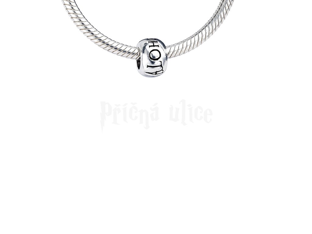 Tento stříbrný korálek má vyrytý odemykací amulet Alohomora, který odemyká dveře nebo okna zamčená zamykacím kouzlem. Použijte tento korálek k rozmístění a zvýraznění přívěsků na vašem náramku.