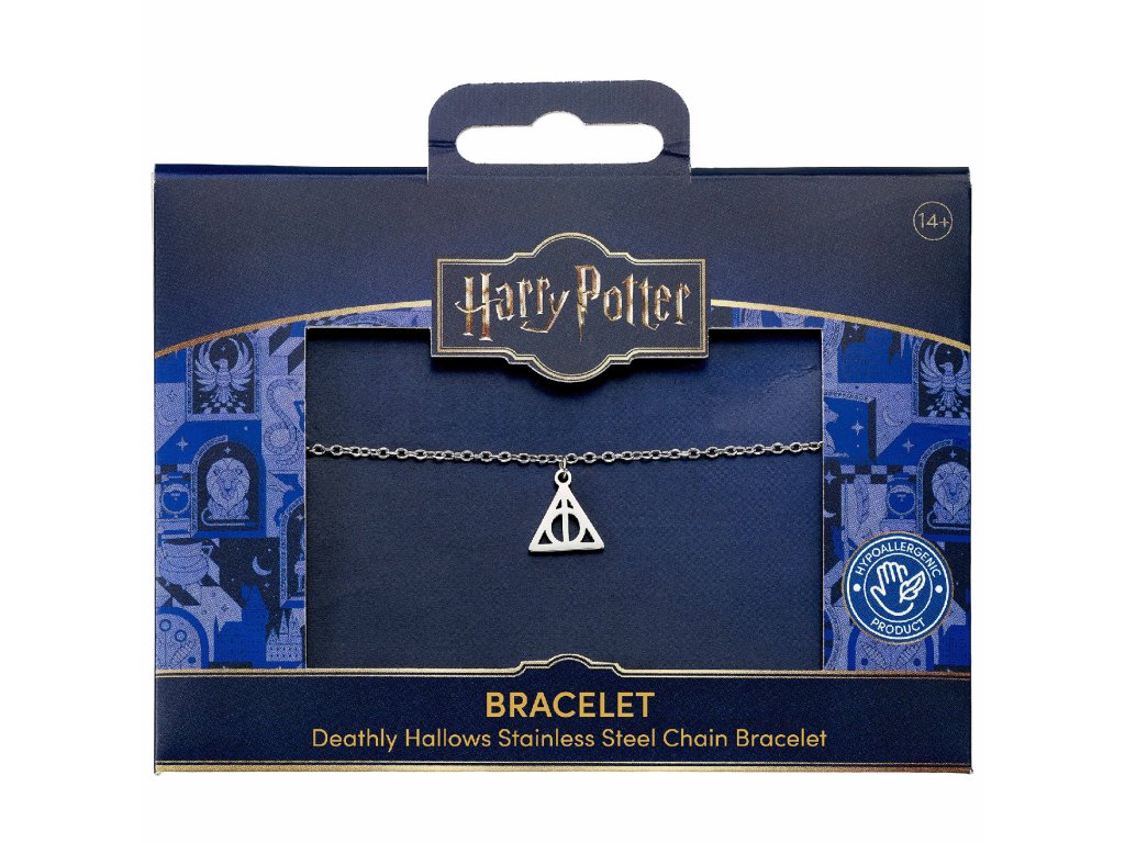 Tento řetízkový náramek z nerezové oceli s motivem Harryho Pottera je opatřen přívěskem Relikvie smrti a má nastavitelnou délku 16–18 cm. Je vyroben z odolné nerezové oceli, je hypoalergenní a ideální pro osoby s citlivou pokožkou. Díky PVD povlaku je náramek odolný vůči opotřebení. Balení ve tvaru obálky z něj činí skvělý dárek. Vhodný od 14 let.