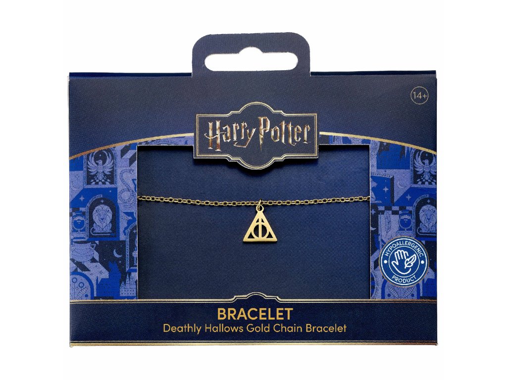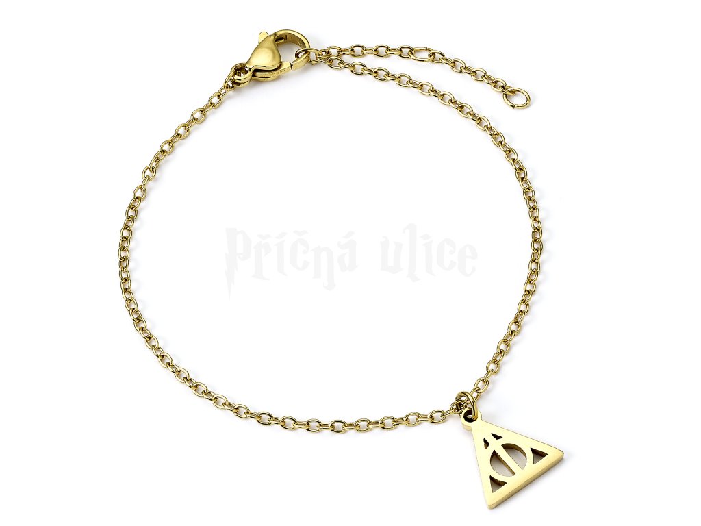Náramek z nerezové oceli s pozlaceným povrchem. Na řetízku visí ikonický symbol Relikvií smrti, který lze nastavit na délku 16-18 cm. Náramek je vyroben z pevné nerezové oceli, takže je bezpečný pro všechny typy pleti, a díky PVD povlaku je odolný a odolný vůči opotřebení. Dodává se v roztomilém balení ve tvaru obálky, takže je perfektním dárkem. Vhodný od 14 let.
