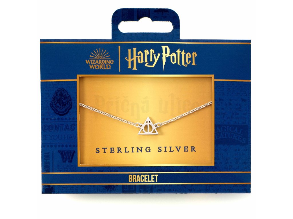 Važte si moci Relikvií smrti s tímto jemným náramkem s přívěskem ze sterlingového stříbra! Náramek obsahuje detailní přívěsek symbolizující tři předměty: Bezovou hůlku, Kámen vzkříšení a Plášť neviditelnosti. Vyrobený ve Velké Británii. Náramek 17 cm s možný prodloužením 5cm. Vhodné od 14 let.
