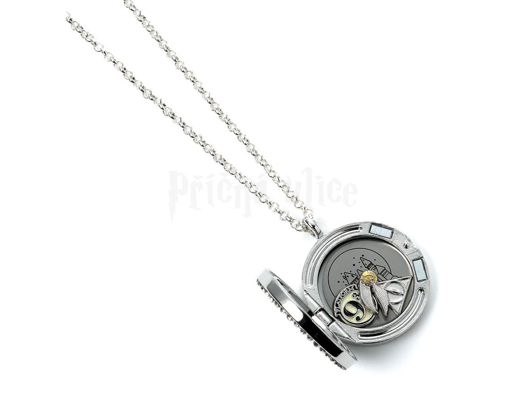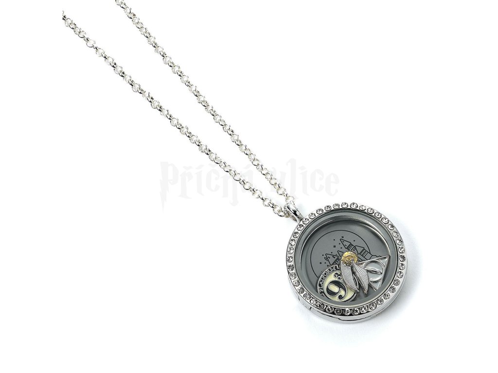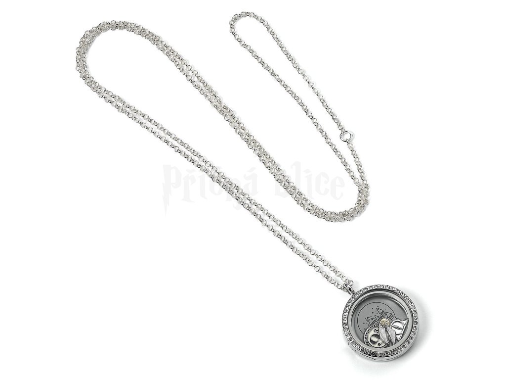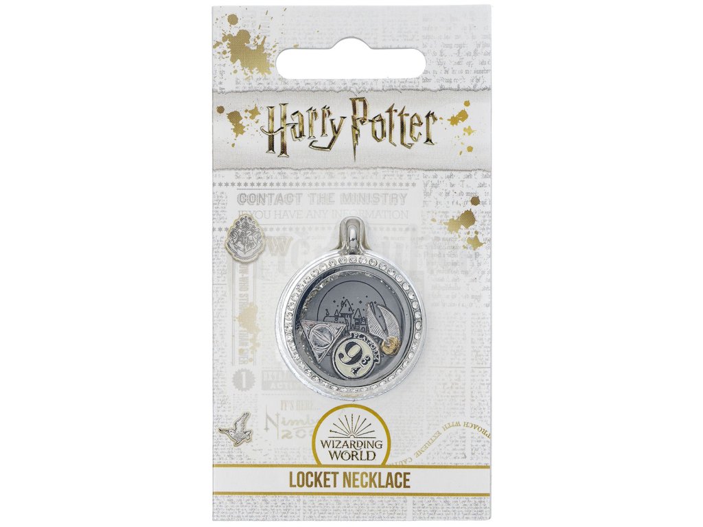 Luxusní přívěsek v podobě otevíracího medailonu, ve kterém jsou schovány tři ikonické znaky Harryho Pottera - Zlatonka, Relikvie smrti a znak Nástupiště 9 a 3/4. Medailon je vyroben z postříbřeného kovu a opatřen skleněnými krystaly.