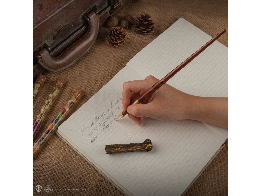 Pero připomínající hůlku není jen replikou z Harryho Pottera, ale také plnohodnotným perem vhodným pro běžné psaní. Toto pero je vybaveno vlastním stojánkem a záložkou označenou jménem majitele hůlky, která vám pomůže sledovat přečtené stránky.