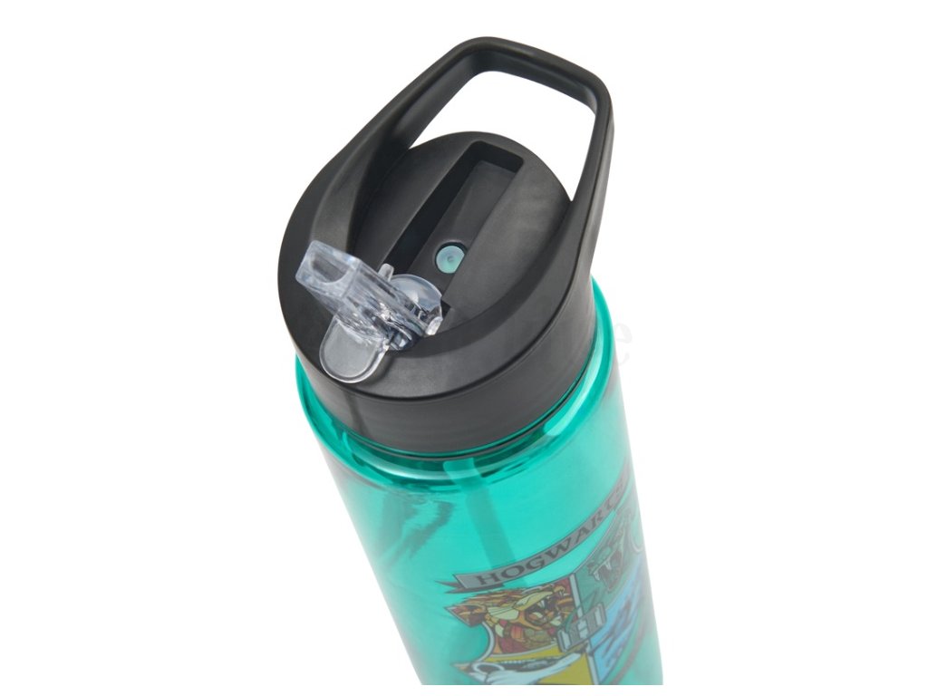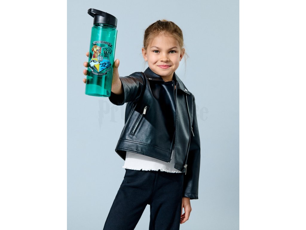 Průhledná plastová lahev s nápisem Hogwarts a erbem bradavické školy čar a kouzel, praktický dárek pro velké i malé fanoušky magického světa.