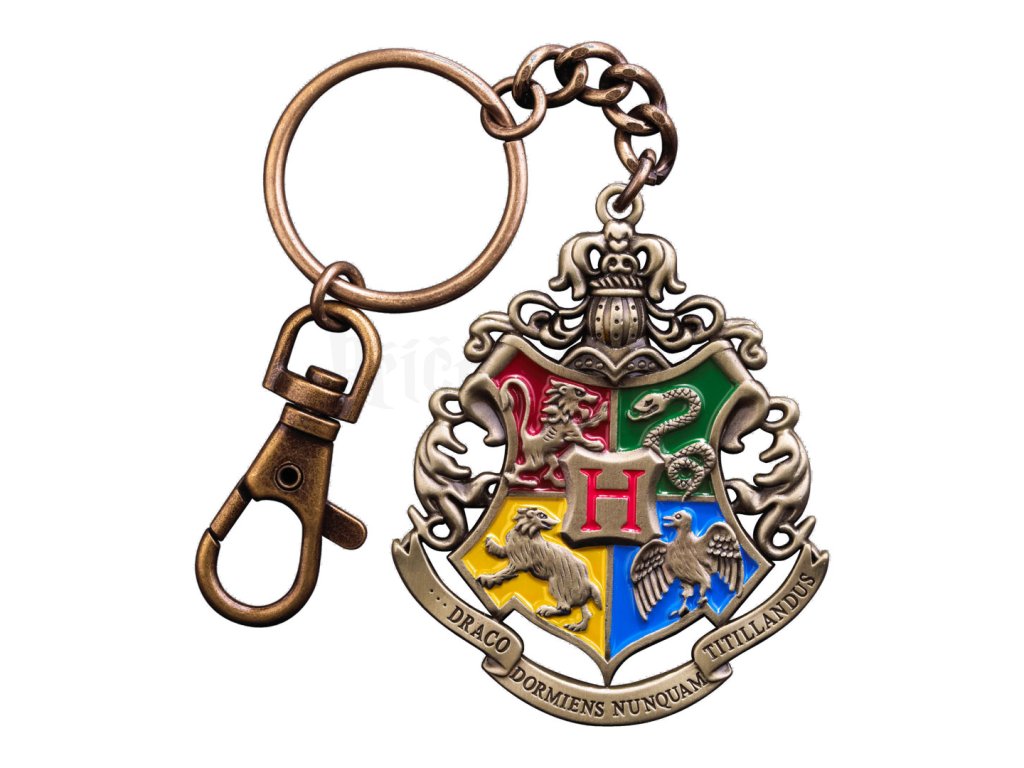 Kovová klíčenka s erbem Školy čar a kouzel v Bradavicích, doplněná červenými, modrými, žlutými a zelenými smaltovanými detaily. Klíčenka je dodávána na kartě a v krabičce s průhledným okénkem v bradavické fialové barvě, s oficiálním logem Harry Potter.