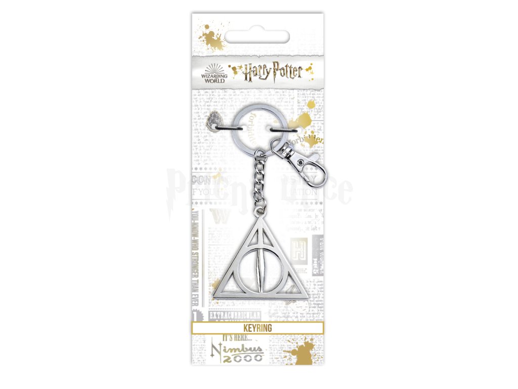 Klíčenka Relikvie smrti na postříbřeném kroužku a klipu symbolizuje tři nejmocnější magické předměty – Plášť neviditelnosti, Kámen vzkříšení a Bezovou hůlku. Měří přibližně 50 mm. Vhodná od 14 let.
