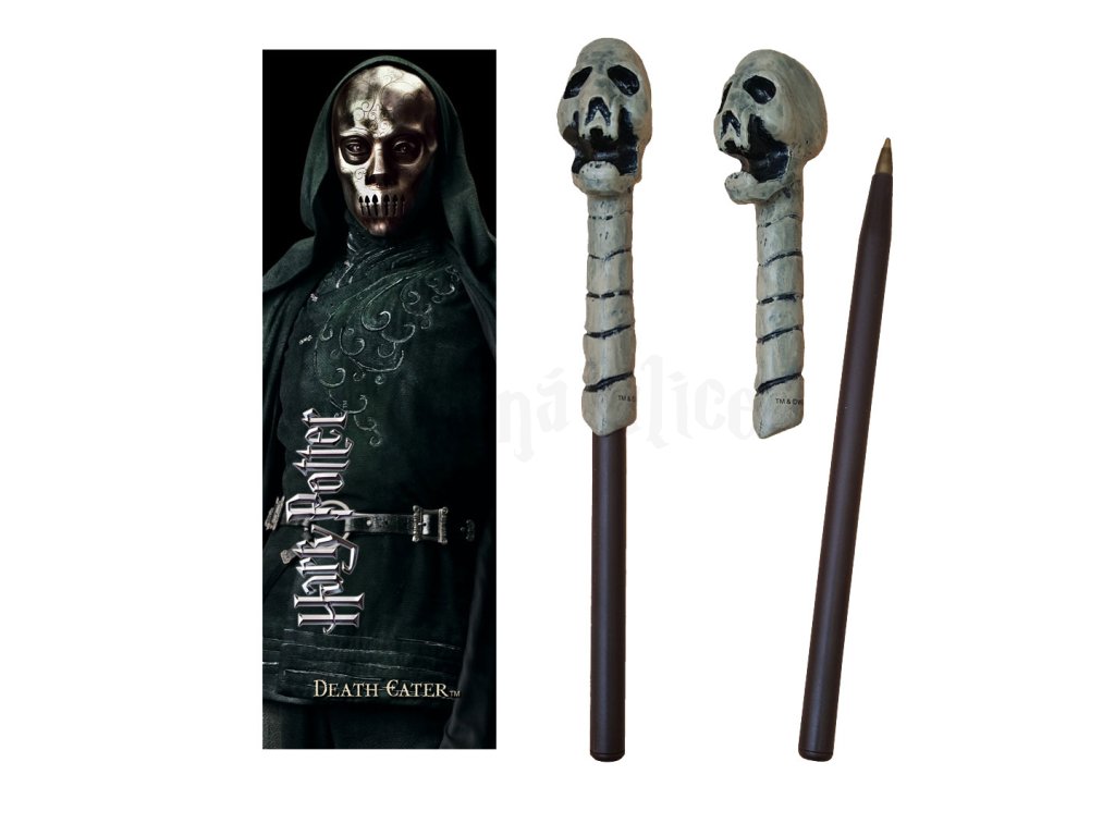 Propiska a záložka Smrtijeda s lebkou. Propiska ve tvaru hůlky Smrtijeda s motivem lebky, doplněná o ladící záložku. Propiska má modrý inkoust. Délka: cca 18,5 cm