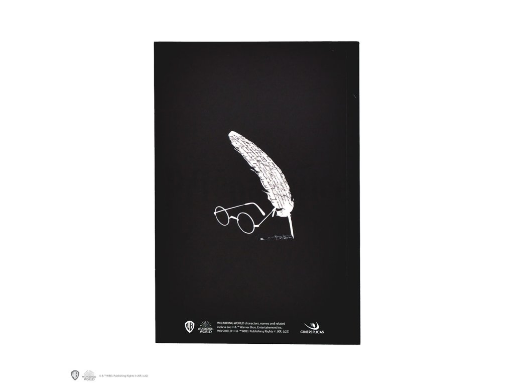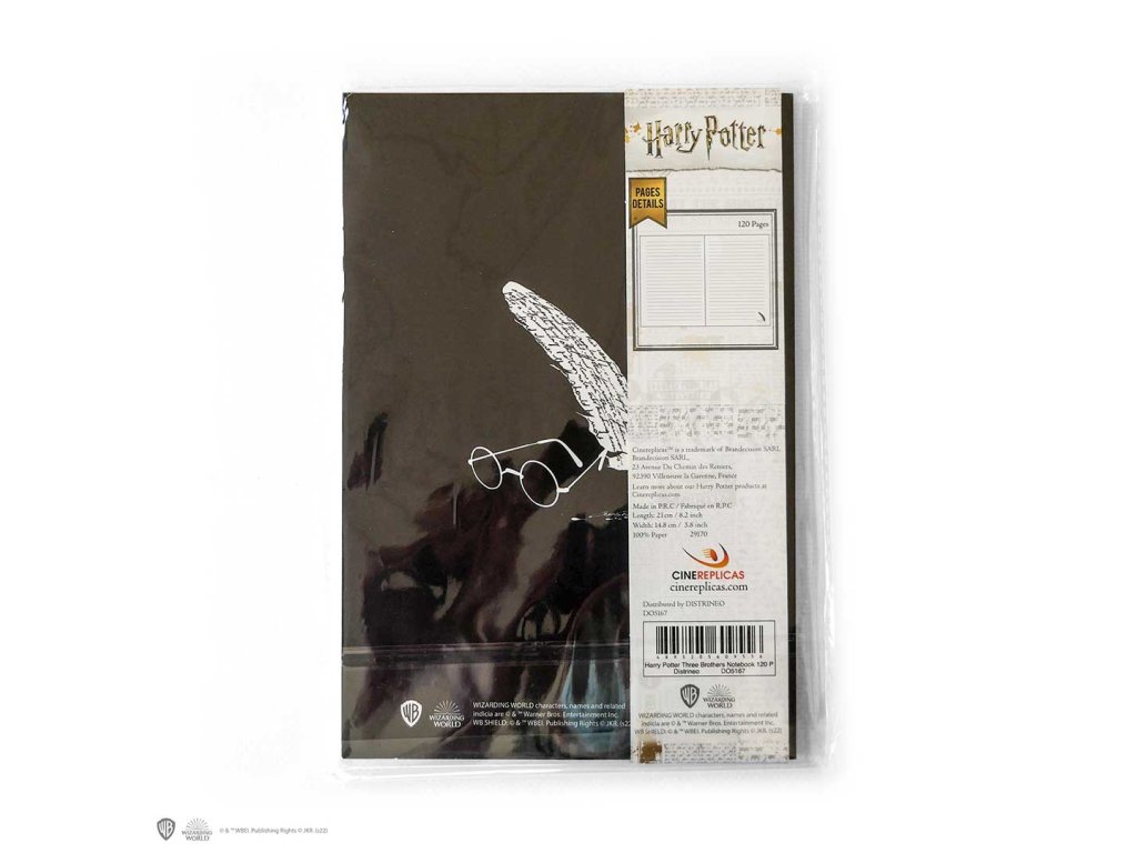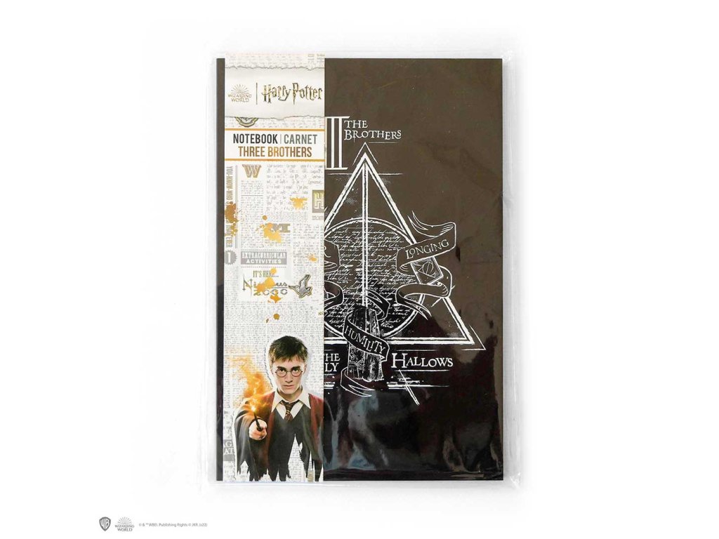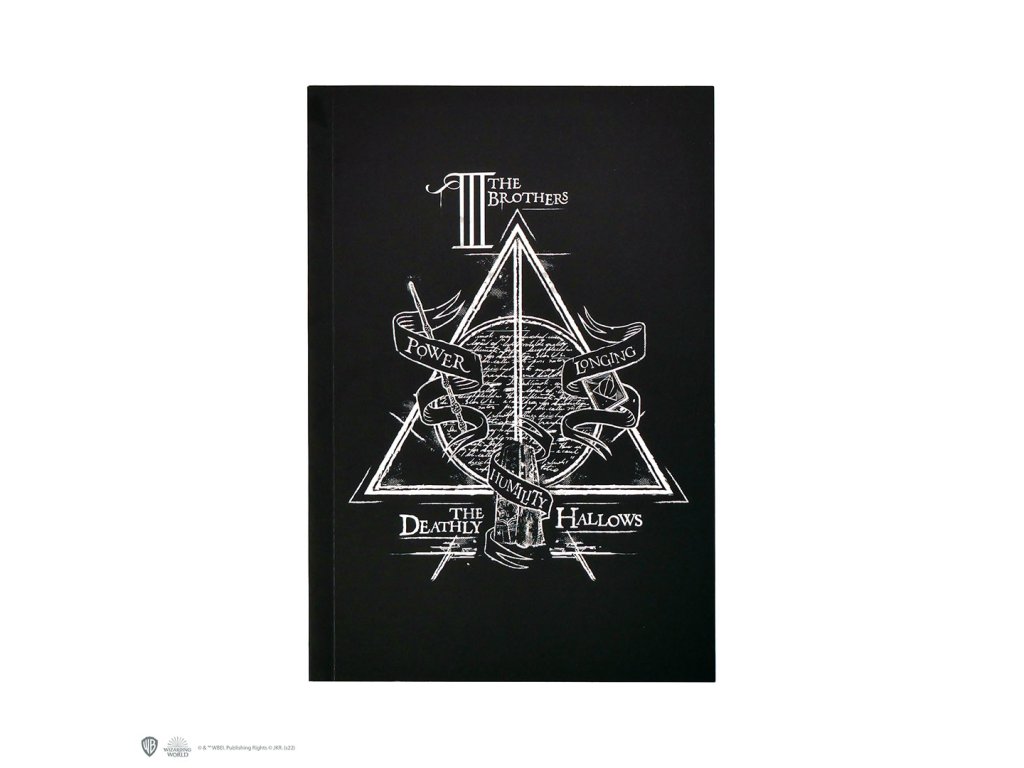 Sešit v měkké vazbě s motivem Harryho Pottera - Relikvie smrti bude skvělým společníkem pro tvé nápady a poznámky z hodin čar a kouzel v Bradavicích. Přední stranu zdobí relikvie smrti - Bezová hůlka, Neviditelný plášť a Kámen vzkříšení, kterými obdarovala smrt tři bratry z fiktivní knihy Bajky Barda Beedleho - Příběh tří bratří. Sešit je linkovaný a design psacího brka a brýlí je přítomen na každé druhé straně i na zadní straně sešitu.