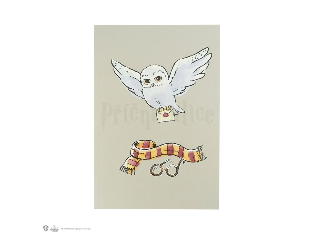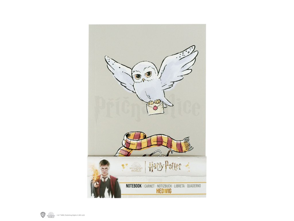 Linkovaný zápisník s postavou ze světa Harryho Pottera. 120 stran, na každé stránce je v rohu obrázek předmětu spojeného s postavou.