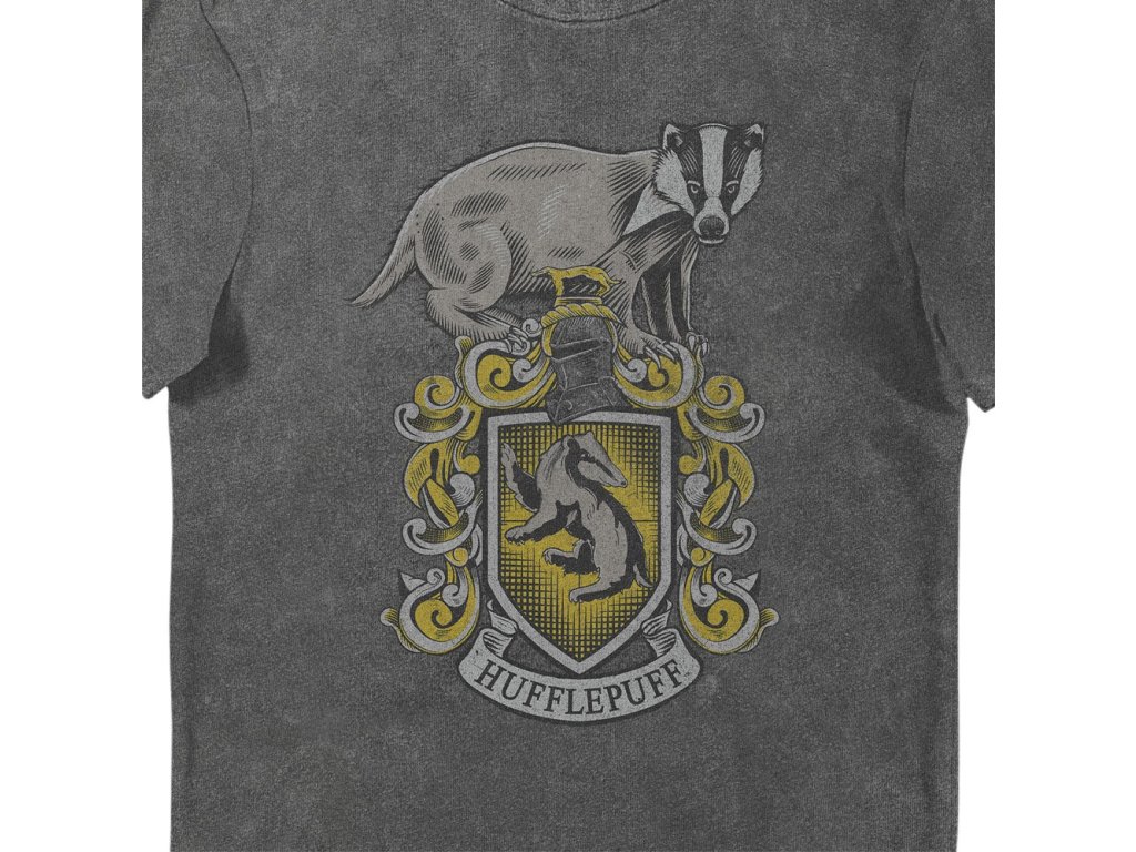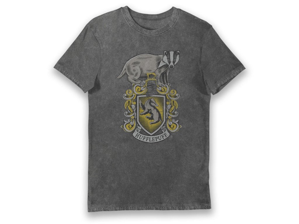 Tričko s krátkým rukávem, s nápisem Hufflepuff ve vintage stylu z vysoce kvalitní bavlny, ošetřené tak, aby kvalita potisku vydržela po mnoho praní.