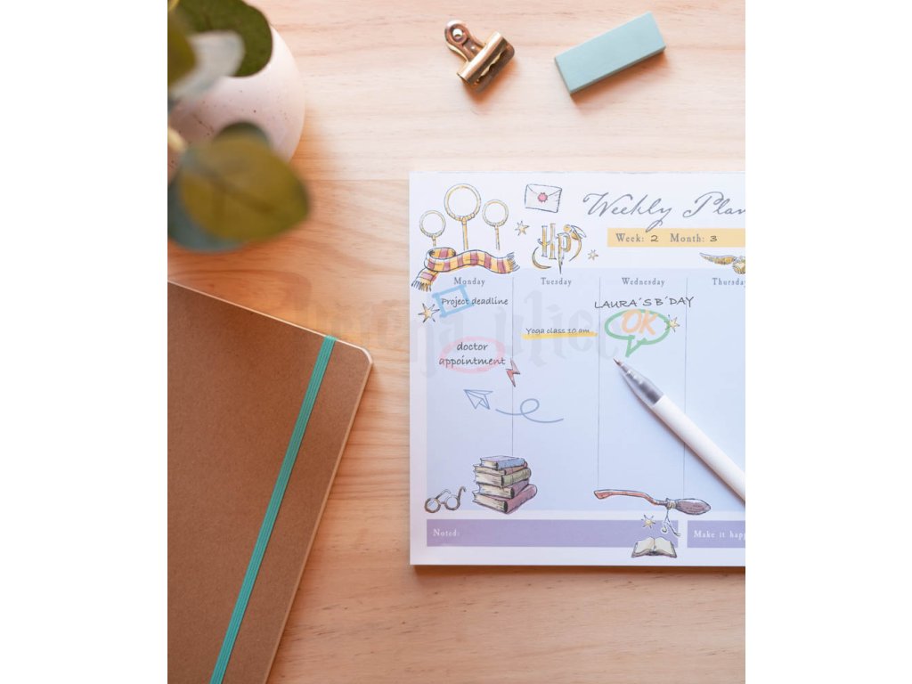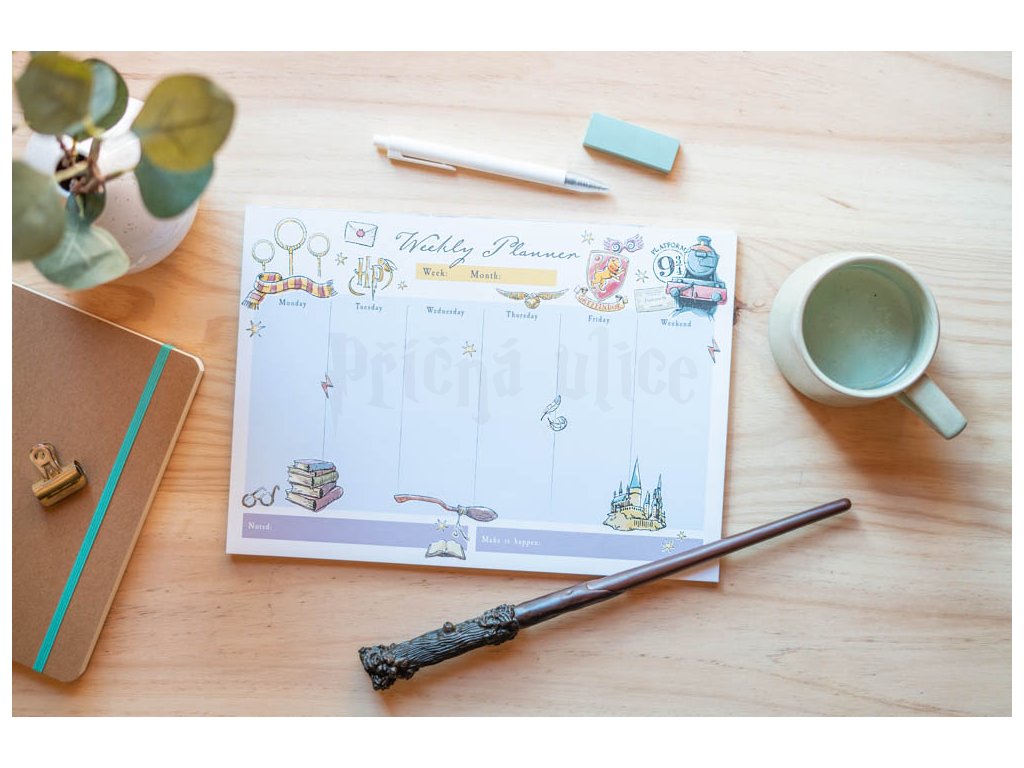 Obsahuje 54 listů s prostorem pro poznámky a týdenní plánování. Součástí je prázdné pole pro nastavení měsíce nebo data. Má lepenou vazbu a je orientován na šířku.