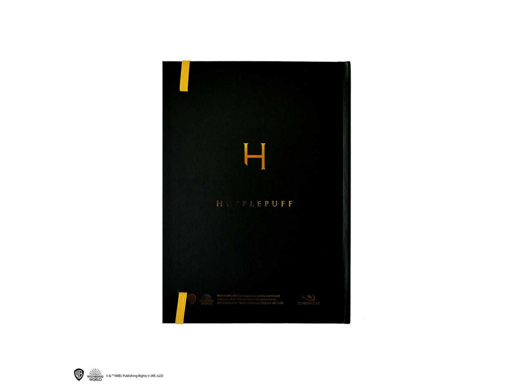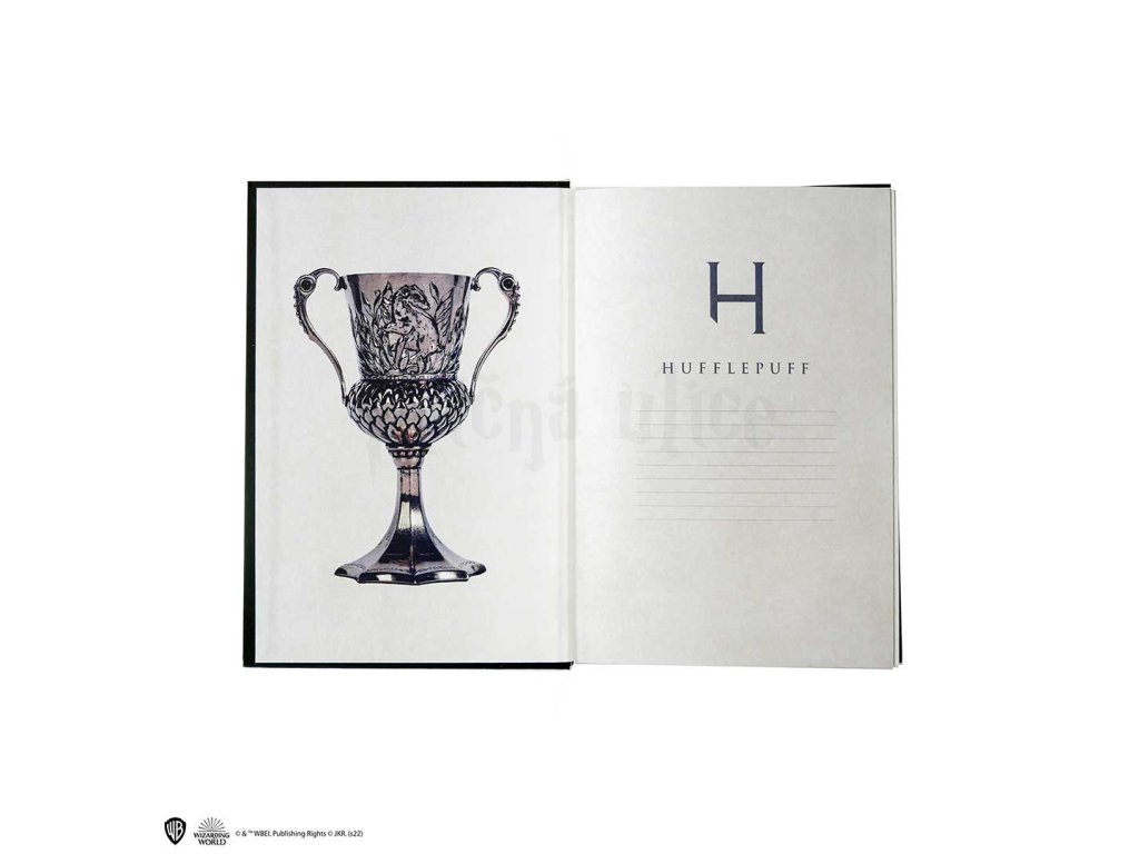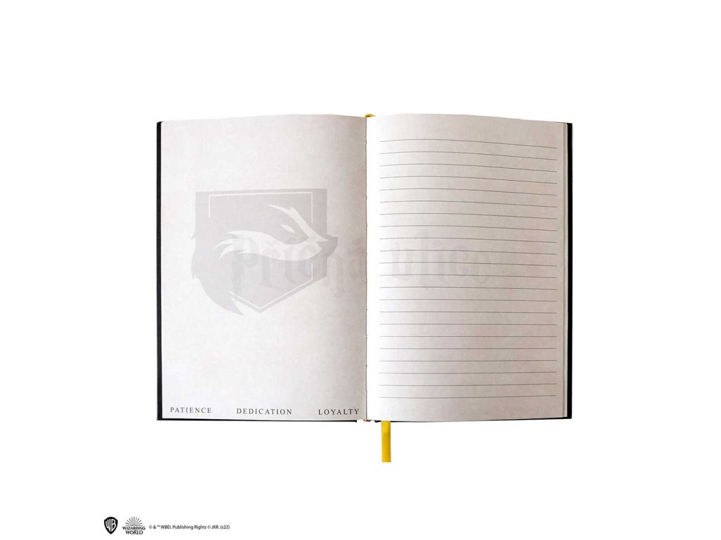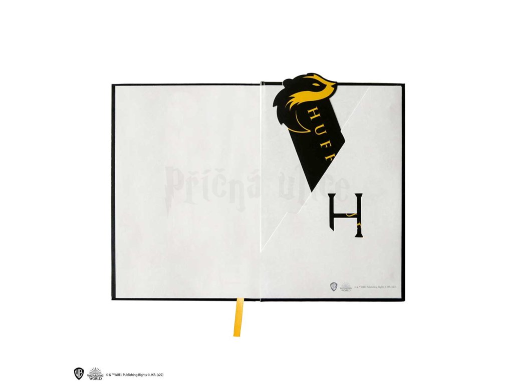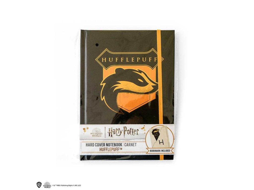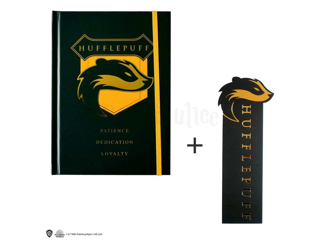 Krásný zápisník v pevných deskách se symbolem koleje Mrzimor z Harry Pottera a stylová papírová záložka v jednom! Skvělý dárek pro malé i velké kouzelníky z Bradavic.
